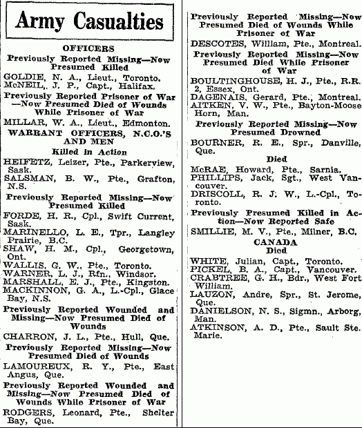 The names of over 200 Canadians are remembered on the Brookwood Memorial. Some perished in ships that were sunken in waters outside the territorial limits of any major campaign; some were lost overboard; some died from various causes on hospital ships or troop transports and were given burial at sea. Also commemorated are those who died during the campaign in Norway in 1940, and in raids on enemy-occupied territory in Europe, including the costly operation against Dieppe in August 1942.