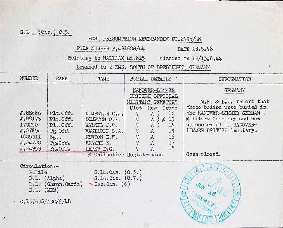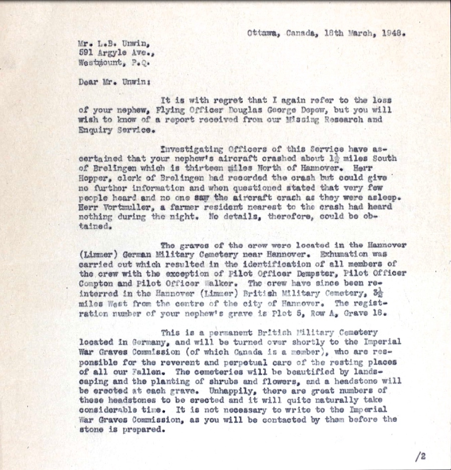 Brother of Pilot Officer Francis Neil Depew, who died while serving with the Royal Canadian Air Force.