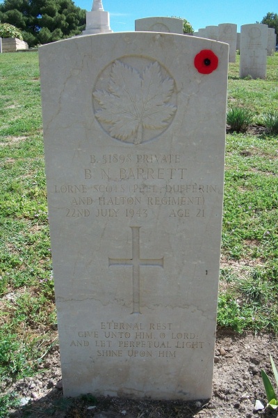 On 10 July 1943, following the successful conclusion of the north African campaign in mid May, a combined allied force of 160,000 Commonwealth and American troops invaded Sicily as a prelude to the assault on mainland Italy. The Italians, who would shortly make peace with the Allies and re-enter the war on their side, offered little determined resistance but German opposition was vigorous and stubborn. The campaign in Sicily came to an end on 17 August when the two allied forces came together at Messina, but failed to cut off the retreating Axis lines. Agira was taken by the 1st Canadian Division of 28 July and the site for the war cemetery was chosen in September for the burial of all Canadians who had been killed in the Sicily campaign. Agira Canadian War Cemetery contains 491 Commonwealth burials of the Second World War.