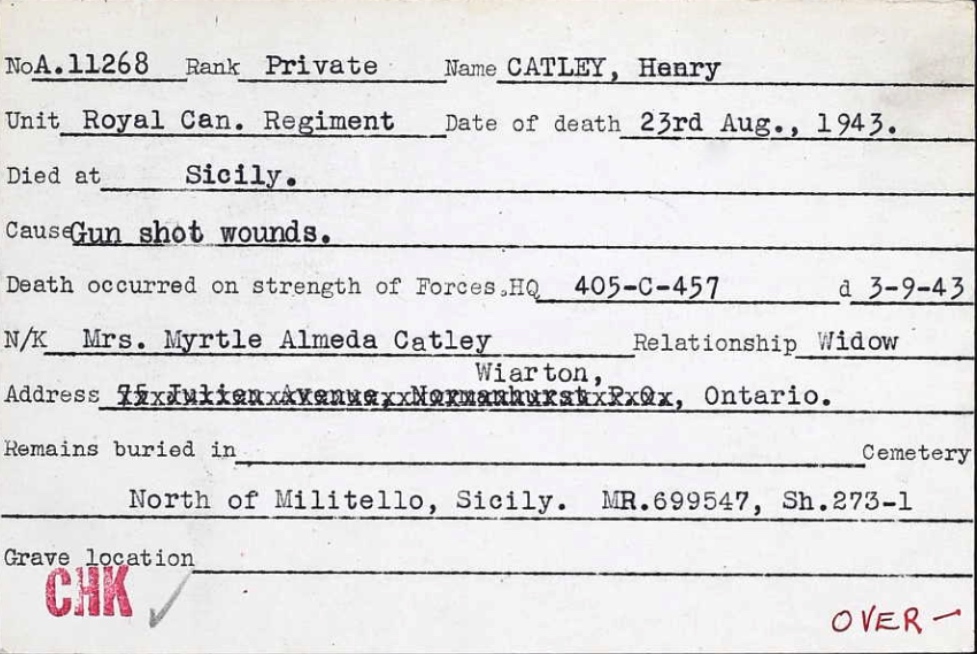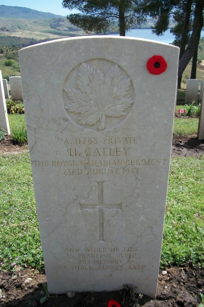 On 10 July 1943, following the successful conclusion of the north African campaign in mid May, a combined allied force of 160,000 Commonwealth and American troops invaded Sicily as a prelude to the assault on mainland Italy. The Italians, who would shortly make peace with the Allies and re-enter the war on their side, offered little determined resistance but German opposition was vigorous and stubborn. The campaign in Sicily came to an end on 17 August when the two allied forces came together at Messina, but failed to cut off the retreating Axis lines. Agira was taken by the 1st Canadian Division of 28 July and the site for the war cemetery was chosen in September for the burial of all Canadians who had been killed in the Sicily campaign. Agira Canadian War Cemetery contains 491 Commonwealth burials of the Second World War.