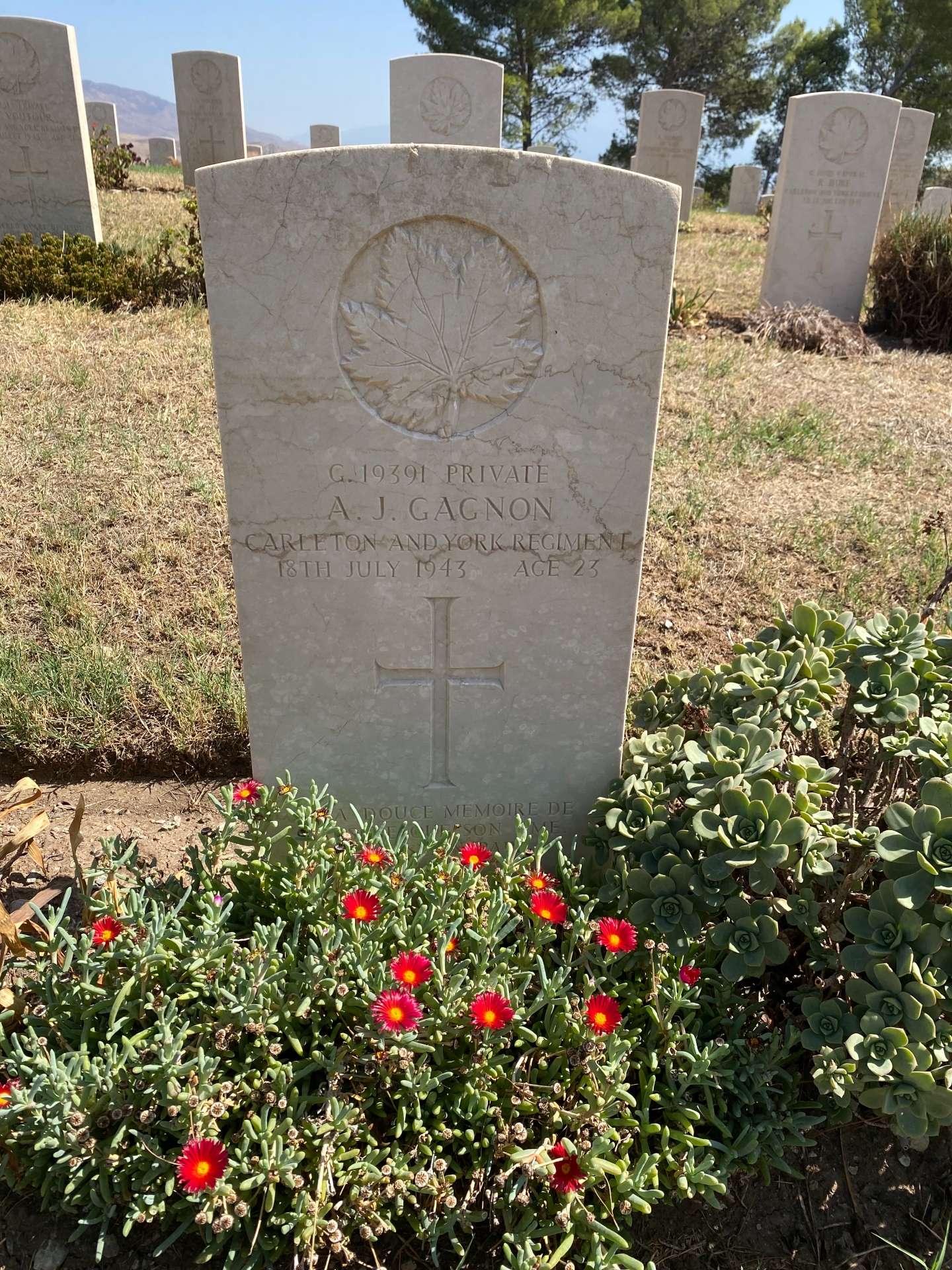 On 10 July 1943, following the successful conclusion of the north African campaign in mid May, a combined allied force of 160,000 Commonwealth and American troops invaded Sicily as a prelude to the assault on mainland Italy. The Italians, who would shortly make peace with the Allies and re-enter the war on their side, offered little determined resistance but German opposition was vigorous and stubborn. The campaign in Sicily came to an end on 17 August when the two allied forces came together at Messina, but failed to cut off the retreating Axis lines. Agira was taken by the 1st Canadian Division of 28 July and the site for the war cemetery was chosen in September for the burial of all Canadians who had been killed in the Sicily campaign. Agira Canadian War Cemetery contains 491 Commonwealth burials of the Second World War.