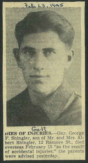 Son of Albert Harvey and Charlotte Rosebella (nee Perks) Shingler, of Galt, Ontario. Brother of Wilfred, William and Olive