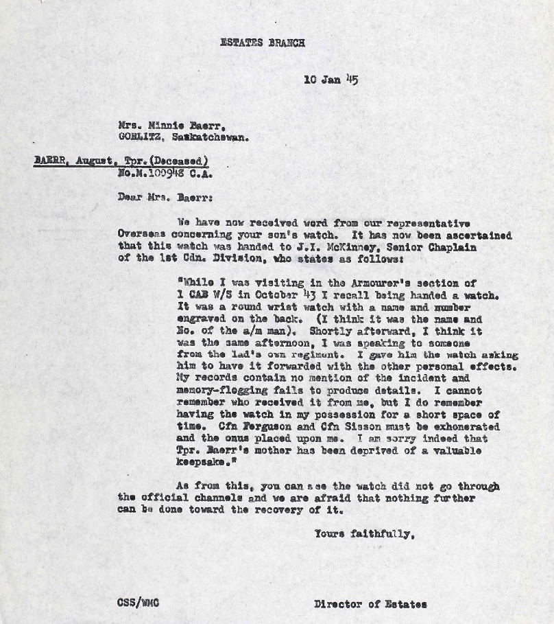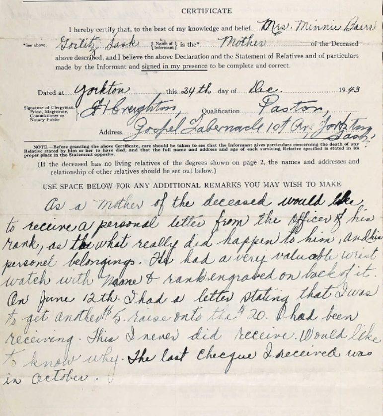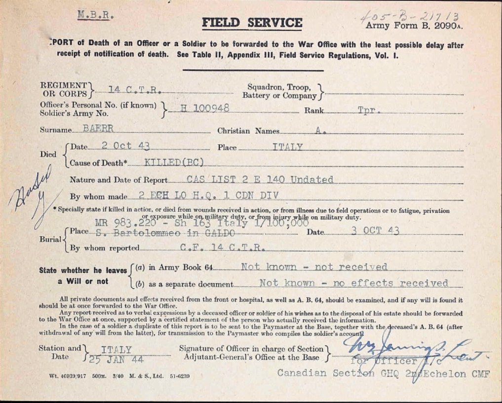 Son of John and Wilhelmina Marine Baer (1994 National Memorial (Silver) Cross Mother) of Gorlitz, Saskatchewan.