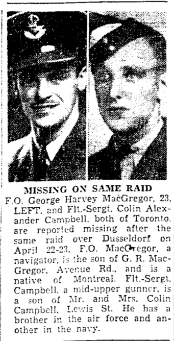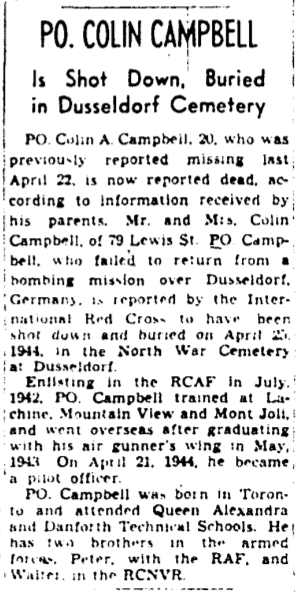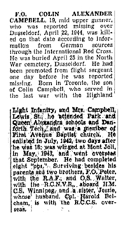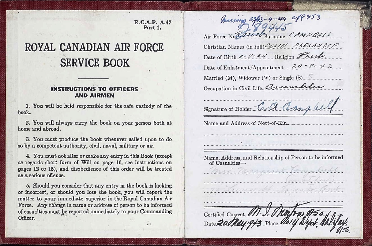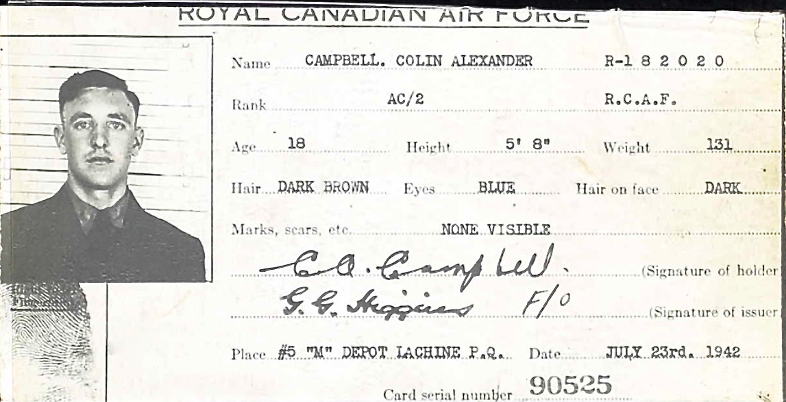 His two brothers served overseas during the Second World War; Peter Campbell, with the Royal Air Force since 1936, and Walter Herbert on board minesweeper HMCS Winnipeg (J337); they both survived the war.