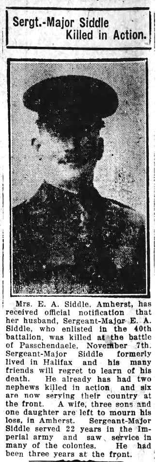 Husband of Maude Siddle, of 39, Harvard St., Halifax, Nova Scotia. Instructor of Officers' Class at Amherst, Nova Scotia.