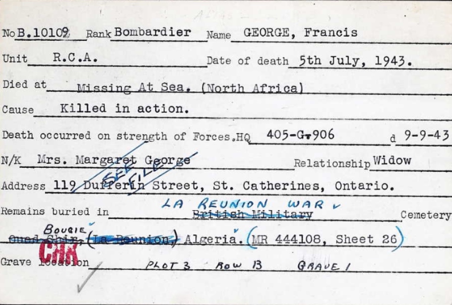 He was one of 53 Canadians who lost their lives on July 4-5, 1943. They were travelling in convoy KMS-18B on their way to Sicily, Italy, for Operation Husky. Three ships (City of Venice, St. Essylt and Devis) were torpedoed and sunk by German u-boats in the Mediterranean Sea near Alger, Algeria.