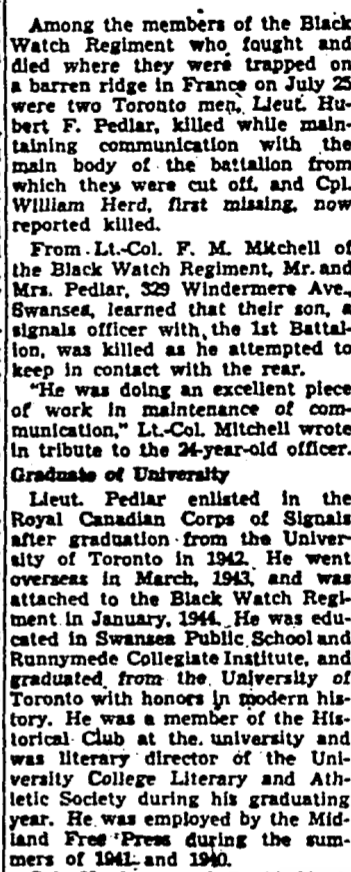 Son of Frederick and Frances Ann Pedlar, of Toronto, Ontario. B.A. Hons. (University of Toronto).