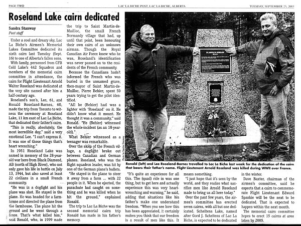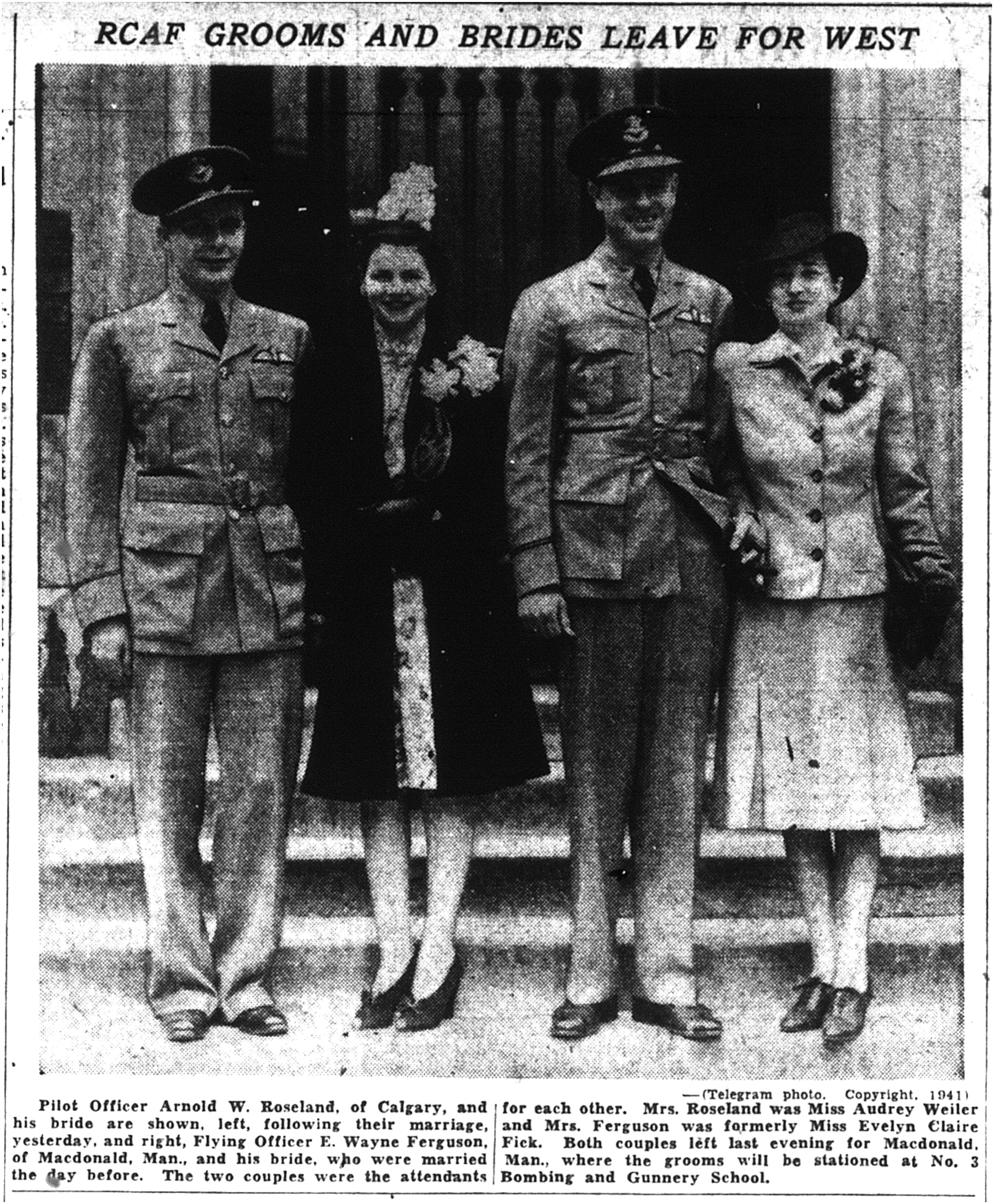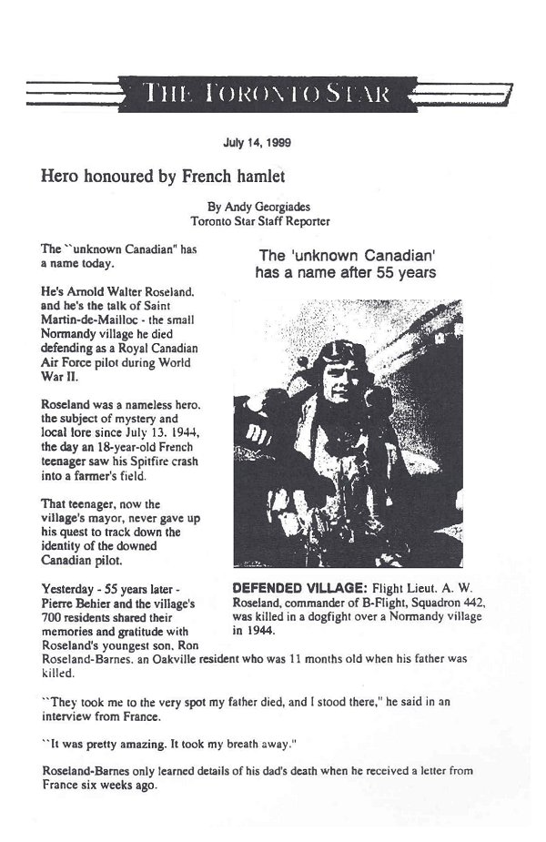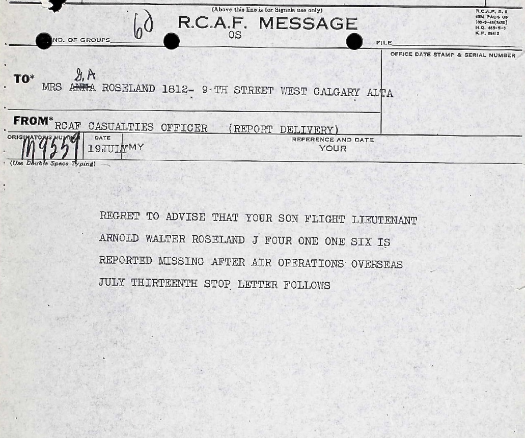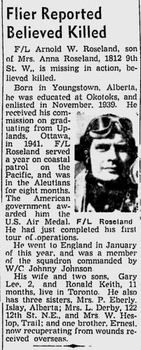 Son of Gustav Andrew and Anna (née Kyland) Roseland of Okotoks, Alberta. Husband of Audrey Edith Weiler (remarried Arnold) and father of Ronald Keith and Garry Lee. Brother of Ernest Gustav, Erling Arthur, Magnald, Gudrun, Alfhid, Hidur and Agnes. While attached to the 11th Air Force of U.S.A.A.F. Flight Lieutenant Roseland was awarded the US Air Medal.