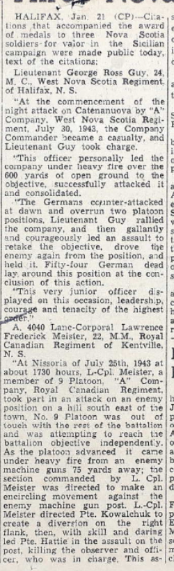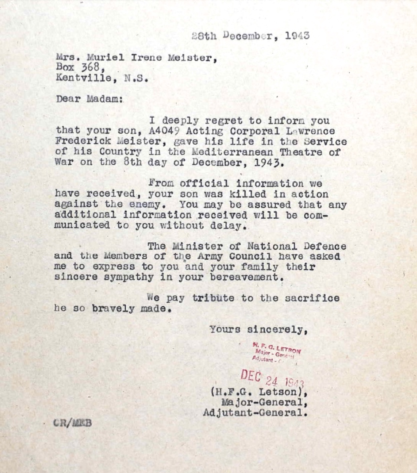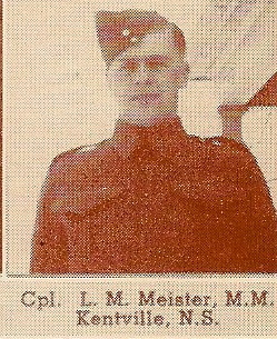 Corporal Lawrence Frederick Meister has been honoured by having Meister Lake named after him. The location of Meister Lake is in Yukon (105B06- 60° 19’ 37”- 130° 22’ 14”).