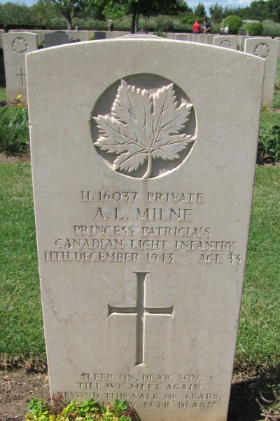 By the winter of 1943, the German armies in Italy were defending a line stretching from the Tyrrhenian Sea north of Naples, to the Adriatic Sea south of Ortona. The Allies prepared to break through this line to capture Rome. For its part, the 1st Canadian Infantry Division was to cross the Moro River and take Ortona. In January 1944 the Canadian Corps selected this site, intending that it would contain the graves of those who died during the Ortona battle and in the fighting in the weeks before and after it. Today, there are 1,615 graves in the cemetery, of which over 50 are unidentified and 1,375 are Canadian.