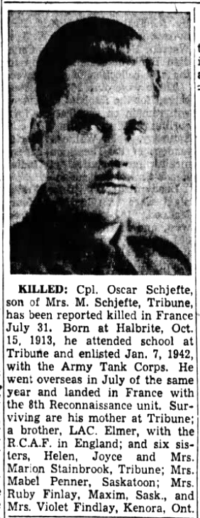 Born 15 October 1915. Son of Edward Schjefte, and of Marie Elisebeth Schjefte, of Tribune, Saskatchewan.