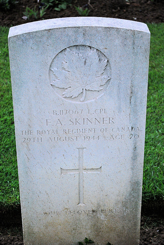 This cemetery lies on the west side of the main road from Caen to Falaise (route N158) and just north of the village of Cintheaux. Bretteville-sur-Laize is a village and commune in the department of the Calvados, some 16 kilometres south of Caen. The village of Bretteville lies 3 kilometres south-west of the Cemetery. Buried here are those who died during the later stages of the battle of Normandy, the capture of Caen and the thrust southwards (led initially by the 4th Canadian and 1st Polish Armoured Divisions), to close the Falaise Gap, and thus seal off the German divisions fighting desperately to escape being trapped west of the Seine. Almost every unit of Canadian 2nd Corps is represented in the Cemetery. There are about 3,000 allied forces casualties of the Second World War commemorated in this site.