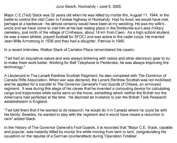 Son of William Leonard and Margaret Aletha Slack of Smiths Falls, Ontario; brother of Leonard James, Maynard John, Alfred Ronald, Amy Mary and the Lieutenant-Colonel William Robert Slack, RCAMC, deceased 4 February 1956 in Korea. Husband of Jean Mills Slack and father of Patricia Jean of Ottawa, Ontario.