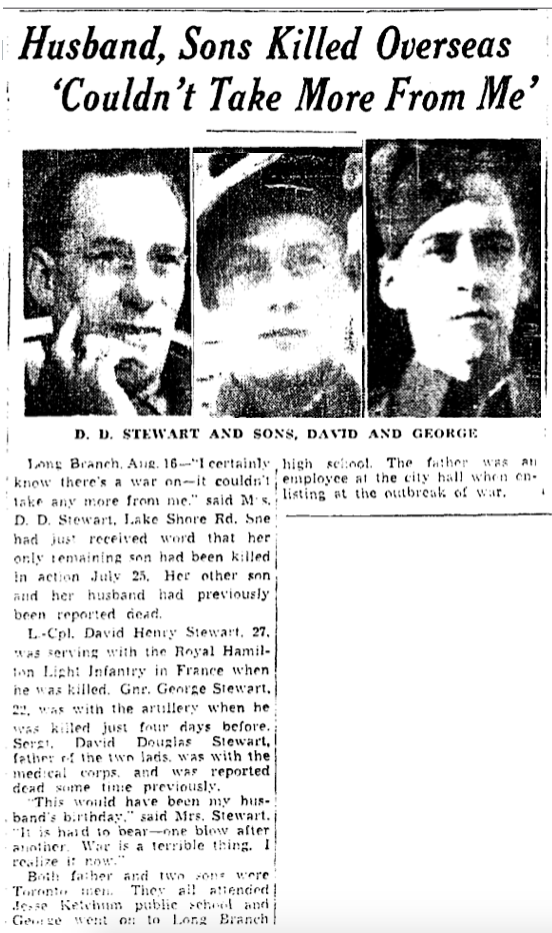Son of Lance Sergeant David Dudley Stewart, Royal Canadian Army Medical Corps, died of wounds on 13 October 1942 and Mary Lillian Stewart of Toronto, Ontario. Brother of Lillian, Mabel, Gertrude, Helen and Gunner George Irwin Stewart, Royal Canadian Artillery, killed in action, 21 July 1944.