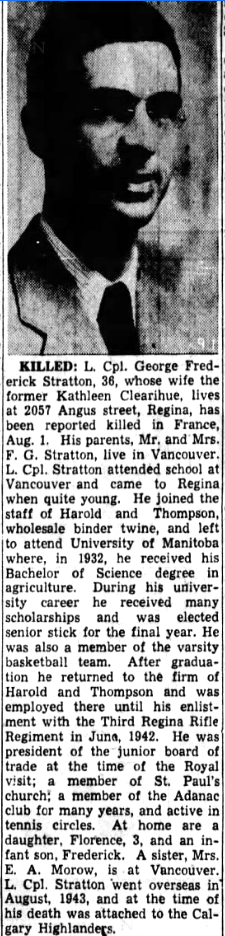 Son of Frederick George and Margaret Jessie Stratton; husband of Kathleen Louise Stratton, of Regina, Saskatchewan. B.S.A. (University of Manitoba). President of Junior Chamber of Commerce, 1938-1939.