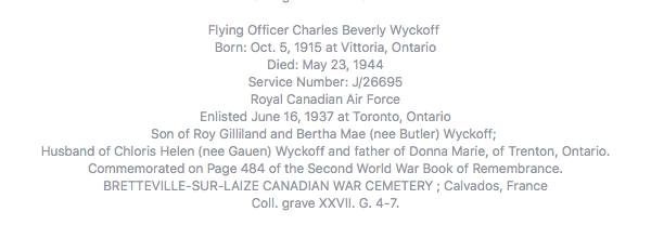 Son of Roy Gilliland and Bertha Mae (nee Butler) Wyckoff, of Vittoria, Ontario; Husband of Chloris Helen (nee Gauen) Wyckoff, of Trenton, Ontario; father of Donna Marie Wyckoff.