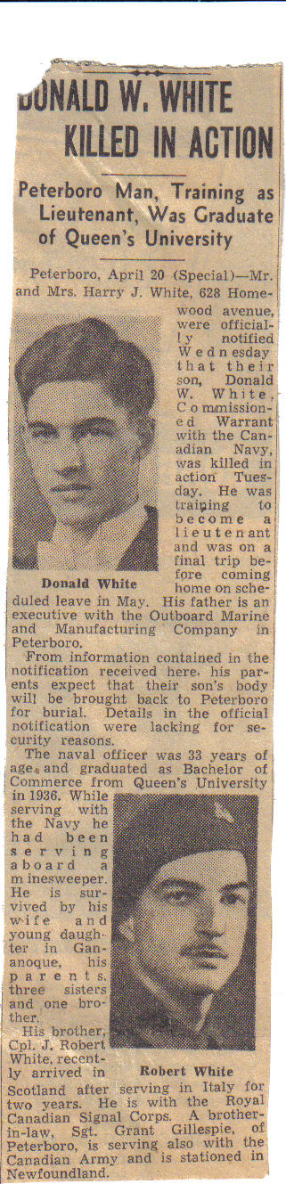 Son of Henry James White and Olive M. White, of Peterborough, Ontario; Husband of Ida M. White, of Gananoque,Ontario.
