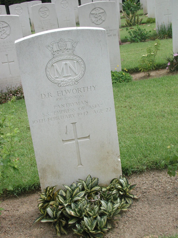 On 5 February 1942, at 11 h am (local time), the Empress of Asia, sailing in convoy, was bombed by Japanese aircraft. The ship caught fire and the captain decided to head for a lighthouse and anchor there to await rescue. It was carrying 2,235 troops from Bombay, India. Casualties totalled 15 soldiers killed and one sailor, Elworthy, who died of his wounds on the 10th in Kranji, Singapore.