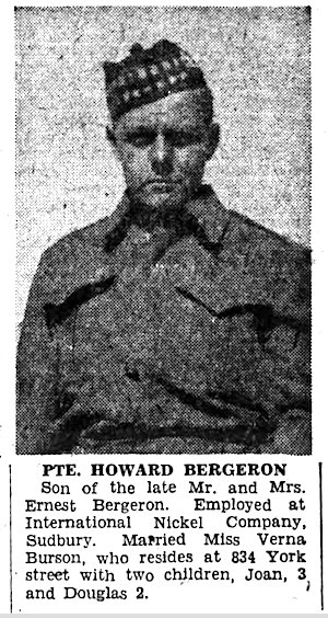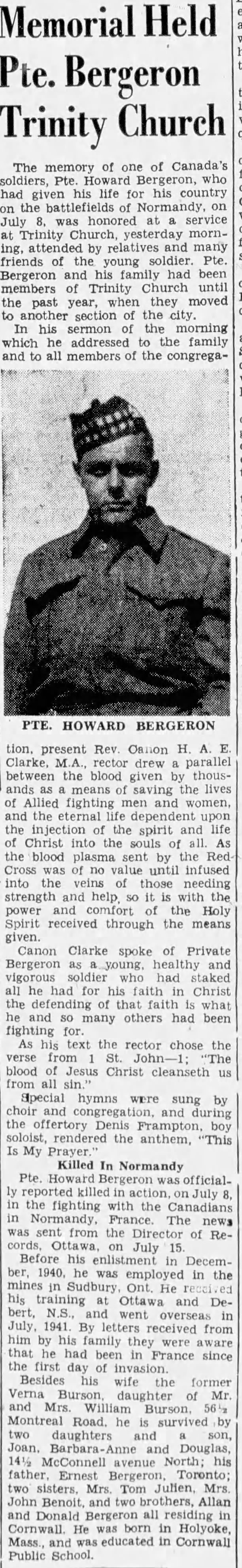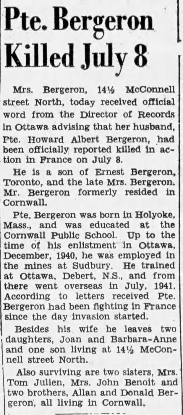 Son of Ernest Bergeron and Annie Bergeron (nee Sheared). Husband of Verna Bergeron (nee Burson), of Moose Creek, Ontario.