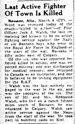 Son of Redmond and Ethel Walsh, of Bassano, Alberta, Canada.