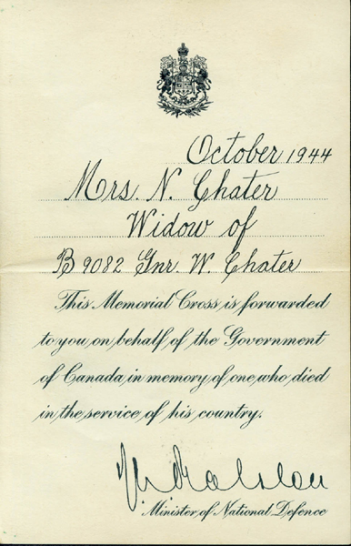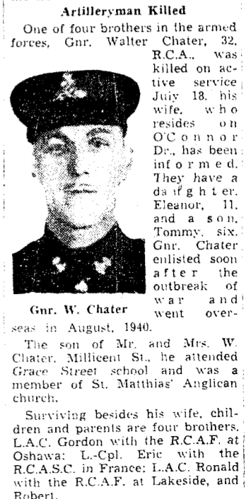 Son of Walter and Eleanor Chater, of Toronto, Ontario. Husband of Norma J. Chater, of Toronto, Ontario.