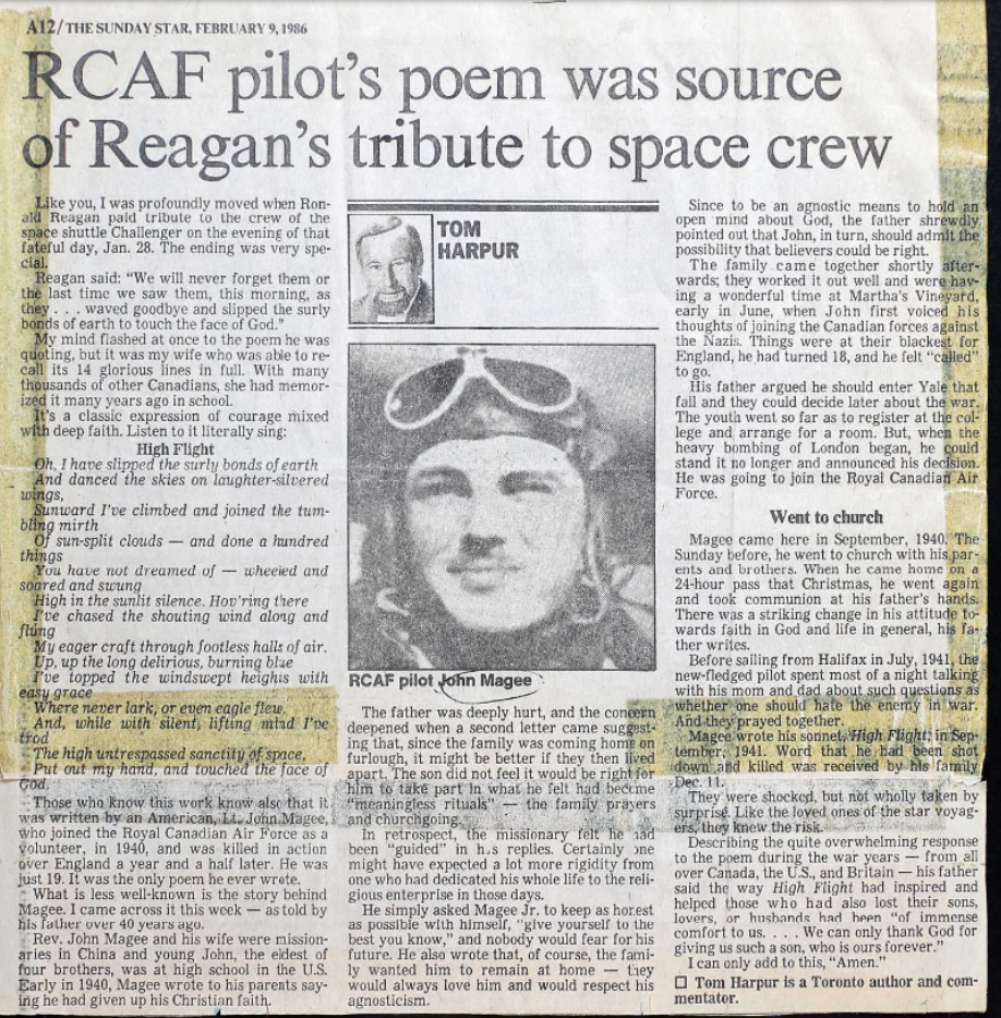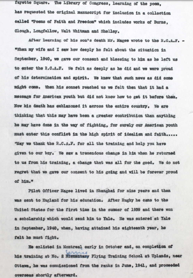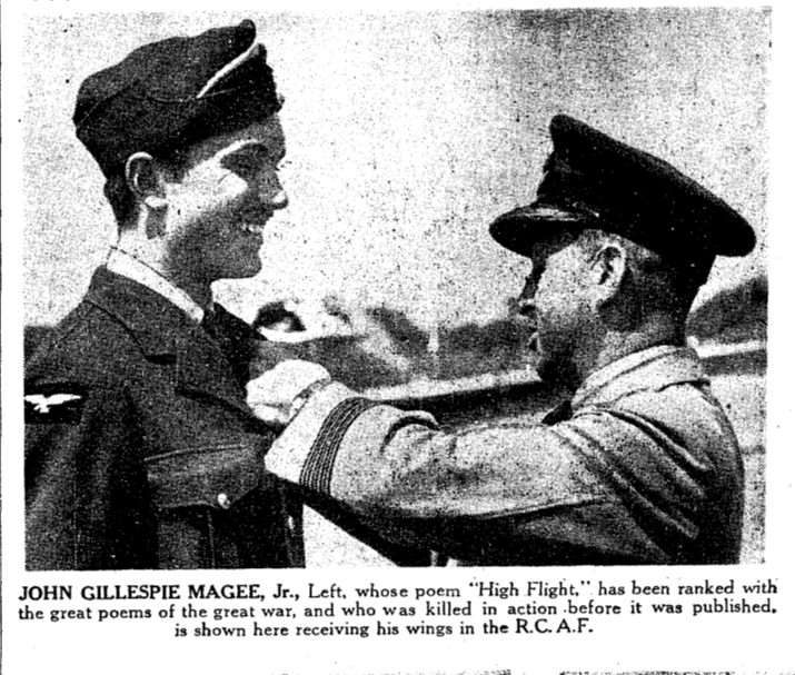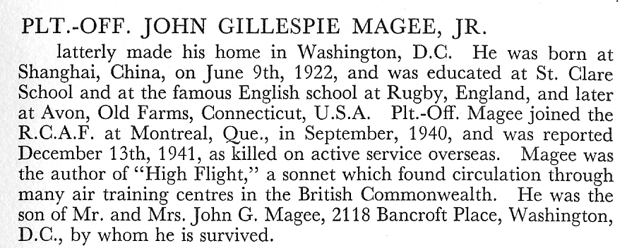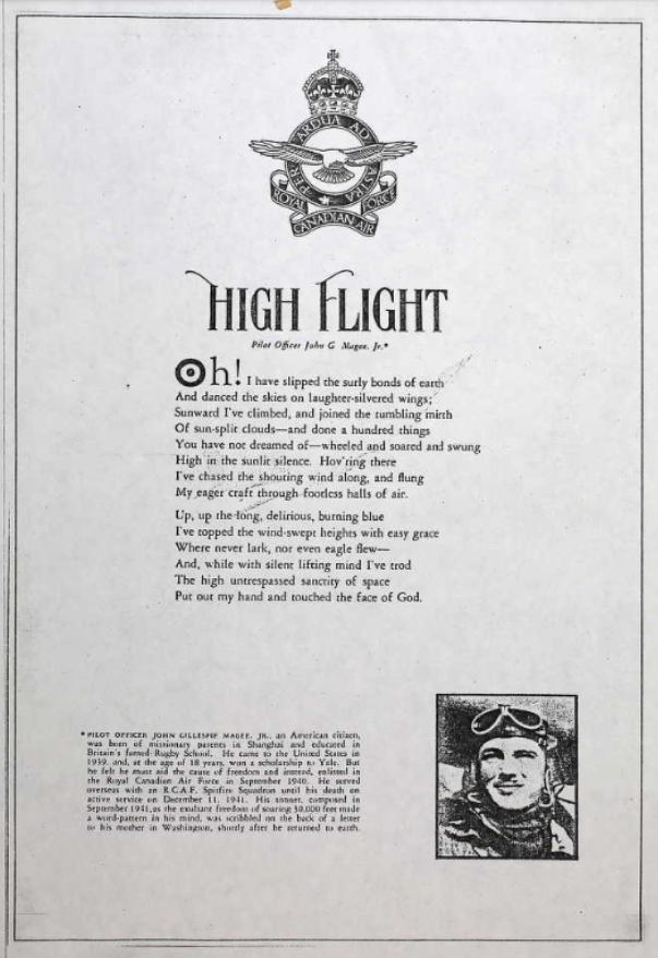 In October, 1940, at age 18, John Magee Jr. went to Canada and enrolled in the RCAF. After his flight training, he went back to England as a commissioned pilot officer. In the course of his training in the Spitfire aircraft, he was assigned to make a high altitude flight 'into the stratosphere'. On landing, he went to his quarters and there wrote his now famous sonnet on the back of a letter to his mother