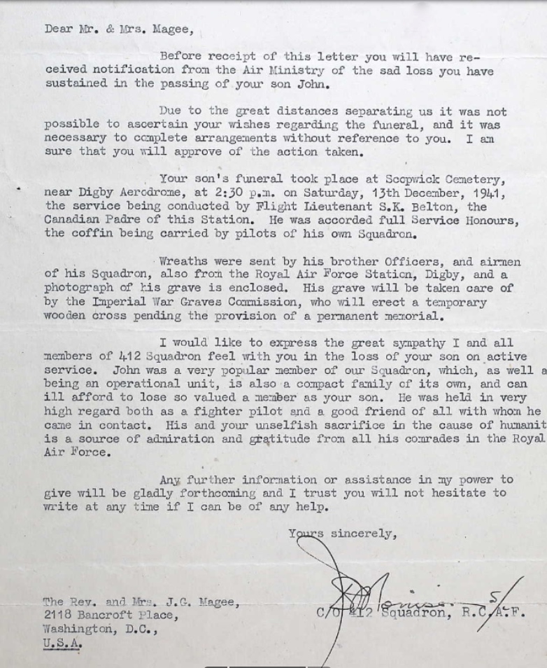 Son of the Reverend John Gillespie Magee and Faith Backhouse Magee, of Washington, D.C., United States. John began his education at the American School, Nanking (1929-1931). In 1931, he moved with his mother to Britain where he continued his education first at St. Clare's near Walmer, Kent (1931-1935) and then at Rugby School (1935-1939) winning the Rugby School's poetry prize in 1938. In 1939 he moved to the USA to live with his aunt in Pittsburgh and attended Avon Old Farms School in Avon, Connecticut. He earned a scholarship to Yale University, where his father was then a chaplain, in July 1940 but did not enroll, choosing instead to enlist in the Royal Canadian Air Force in October of that year.