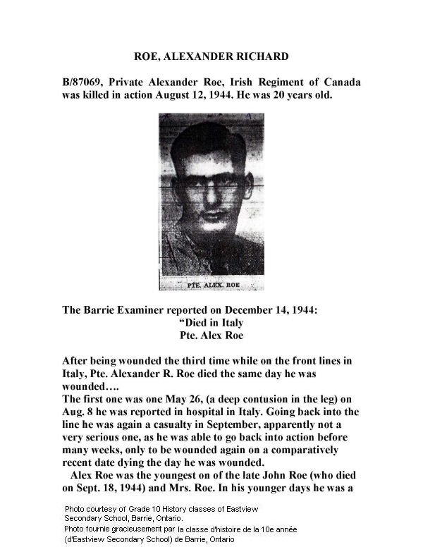Son of John and Christina Roe, of Ingersoll, Ontario, Canada.