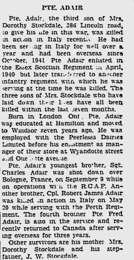 Brother of Corporal Robert James Adair, who died while serving with the Perth Regiment and Sergeant Charles Franklin Adair, who died while serving with the Royal Canadian Air Force.