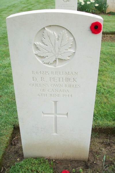 It was on the coast just to the north that the 3rd Canadian Division landed on 6th June 1944; on that day, 335 officers and men of that division were killed in action or died of wounds. In this cemetery are the graves of Canadians who gave their lives in the landings in Normandy and in the earlier stages of the subsequent campaign. Canadians who died during the final stages of the fighting in Normandy are buried in Bretteville-sur-Laize Canadian War Cemetery.