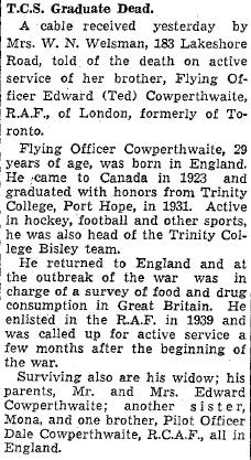 Son of Edward and Eva Cowperthwaite, of Brantford, Ontario. Brother of Flight Lieutenant Lonsdale Cowperthwaite, J/3726, who died on 12 February 1942, and is commemorated on the Runneymede Memorial.