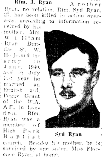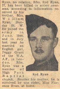 Son of William and Pearl Ryan, of Toronto, Ontario. Husband of Priscilla Elsie Ryan, of Toronto, Ontario.