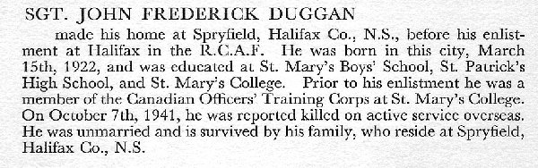Son of W. P. Duggan, and of Gertrude Duggan of Spryfield, Halifax Co., Nova Scotia.