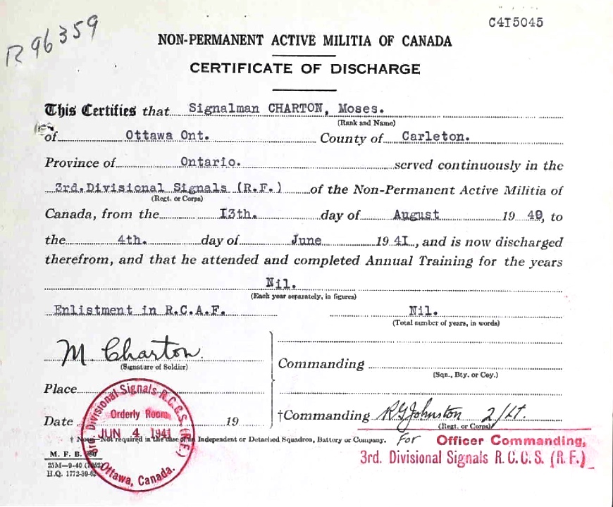 He was a signaller in the 3rd Divisional Signals of the Royal Canadian Corps of Signals - NPAM - in Ottawa, Ontario, regiment no 1985 replaced by C-415045, from 13 August 1940 to 4 June 1941.
