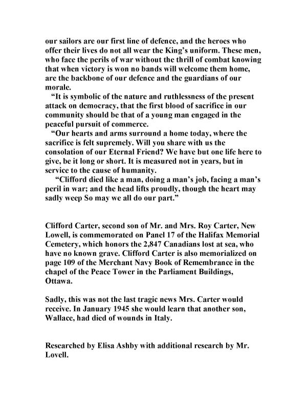 Son of Roy Wesley Carter and Della Edna McGibbon, of Barrie, Ontario. Brother of Gunner Wallace Wilfred Carter, regimental number B-53573, accidentally killed in Villanova, Italy, on December 23, 1944, while serving with the 6th Battalion, 5th Counter-Mortar Regiment, Royal Canadian Artillery, and of Privates Kenneth Roy Carter and Douglas Keith Carter, who fought in Europe. They survived the war.