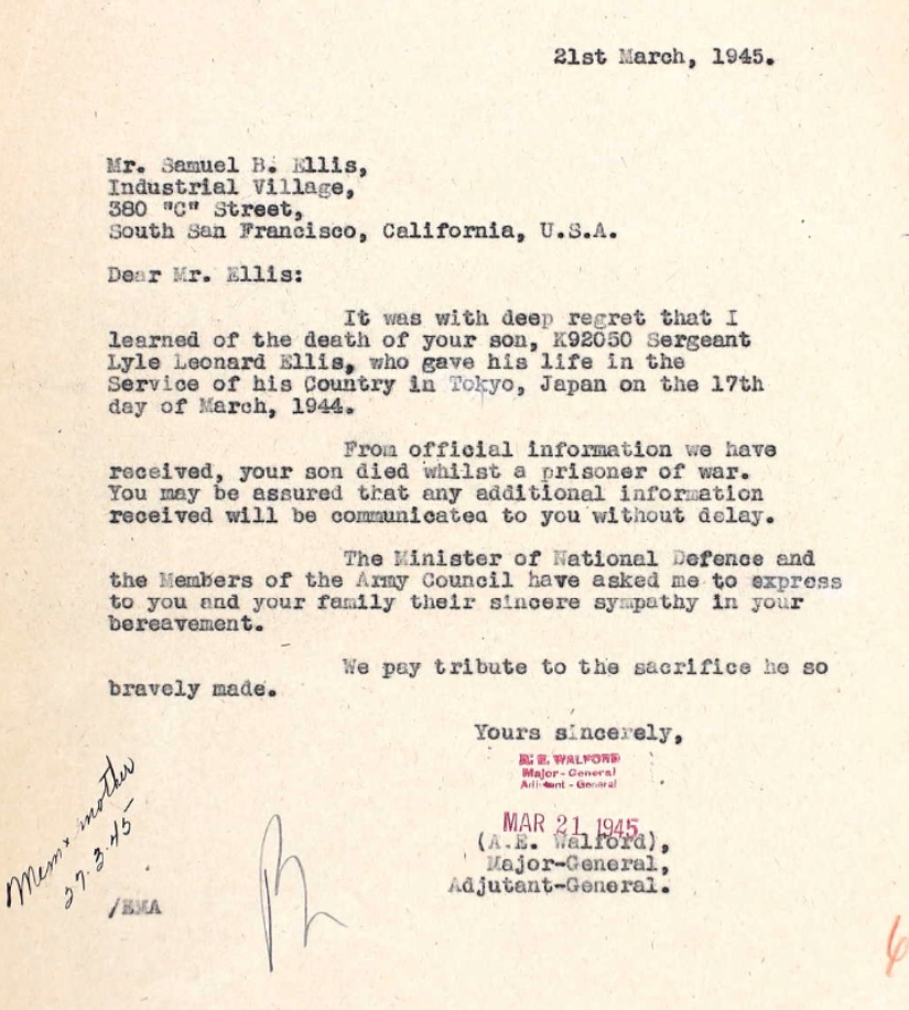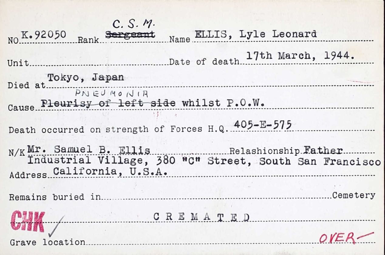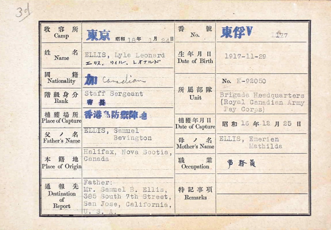 Served in British Columbia, Hong Kong with Force C, Japan as a prisoner of war. Had 1,414 days of service, including 872 overseas.