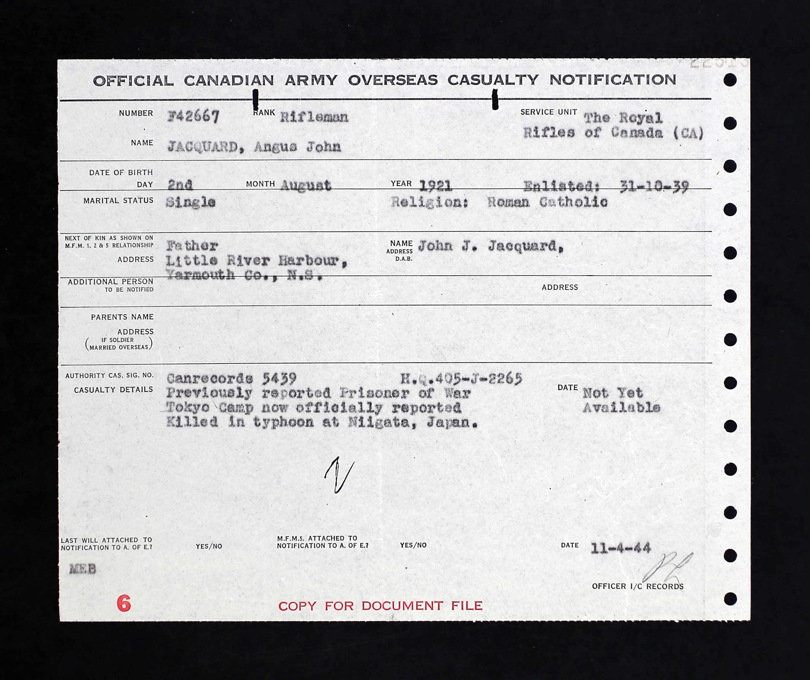 He enrolled with the West Nova Scotia Regiment, was deployed to 1st Battalion, Royal Rifles of Canada, on 28 November 1940, served with Force W in Newfoundland, was transferred to Force C, was captured in Hong Kong and sent to force labour in Japan, from 15 August 1943 until the day he died, 1 January 1944, caused by a typhoon that swept his camp and hut. He had 1,524 days of service, including 796 overseas.