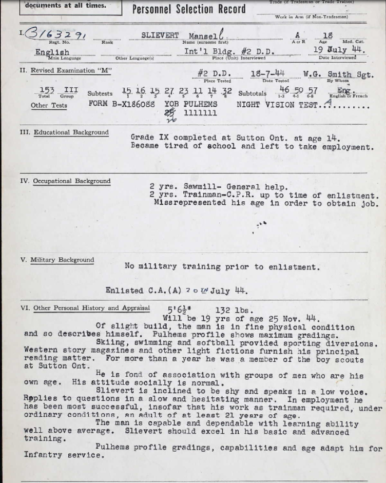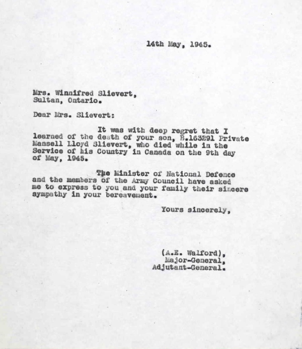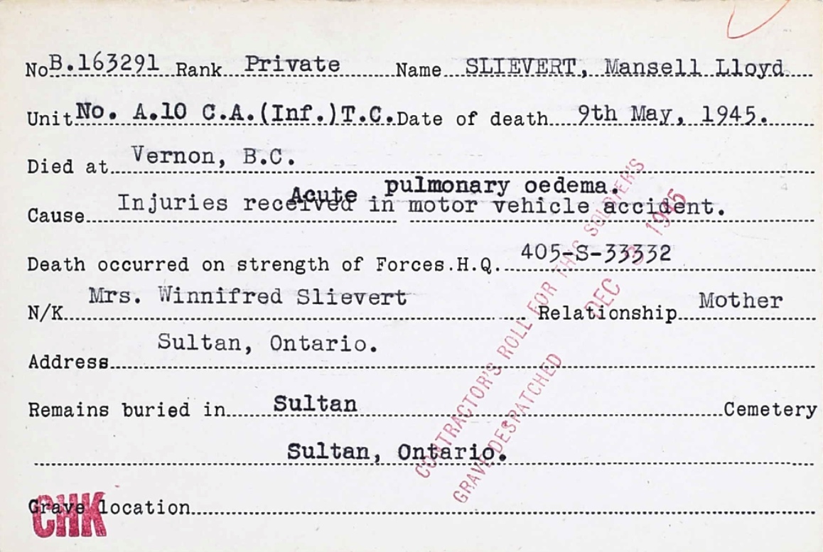 Son of Otto F. Slievert and Winnifred Slievert, of Sultan, Ontario. He was the brother of Kenneth John Slievert who died on September 1, 1944 and he is buried at Montecchio War Cemetery in Italy.