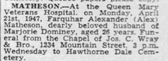 Son of Donald and Martha Matheson, of Westmount; husband of Marjorie Matheson, of Rosemount.