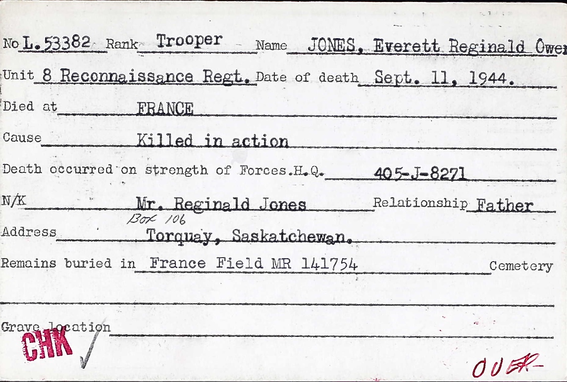 Son of Reginald James Jones and Lily Edna Jones, of Torquay, Saskatchewan.