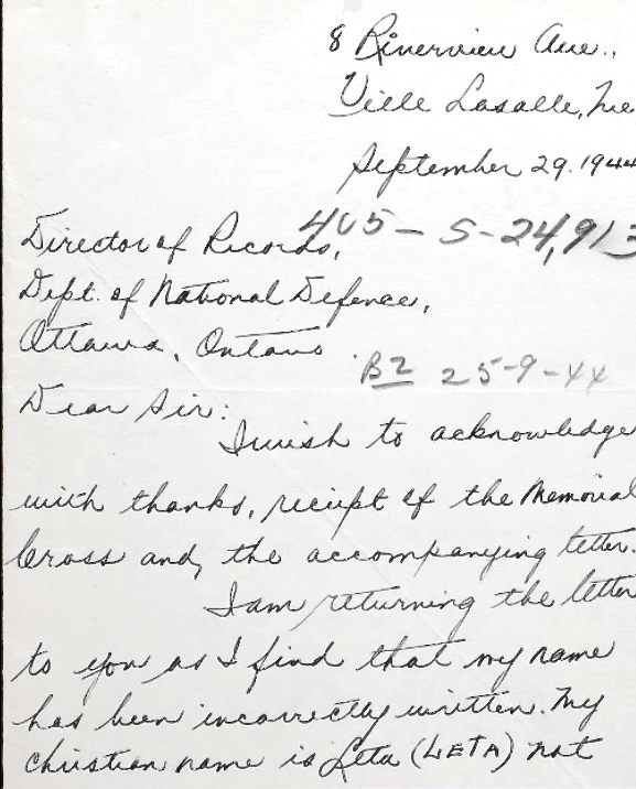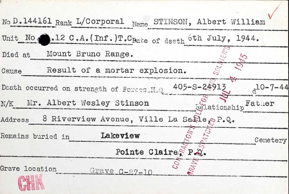 Born 25 November 1925 at Lachine, Quebec. Only child of Albert Wesley Stinson and Leta Dorthea Marie (née Graydon) Stinson, of Ville La Salle, Quebec.