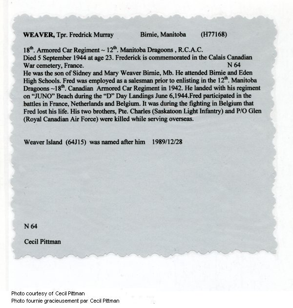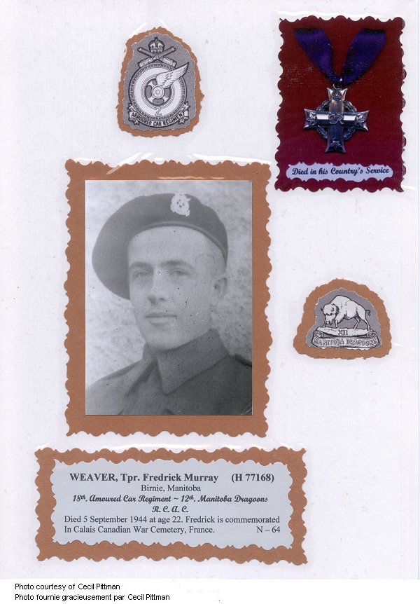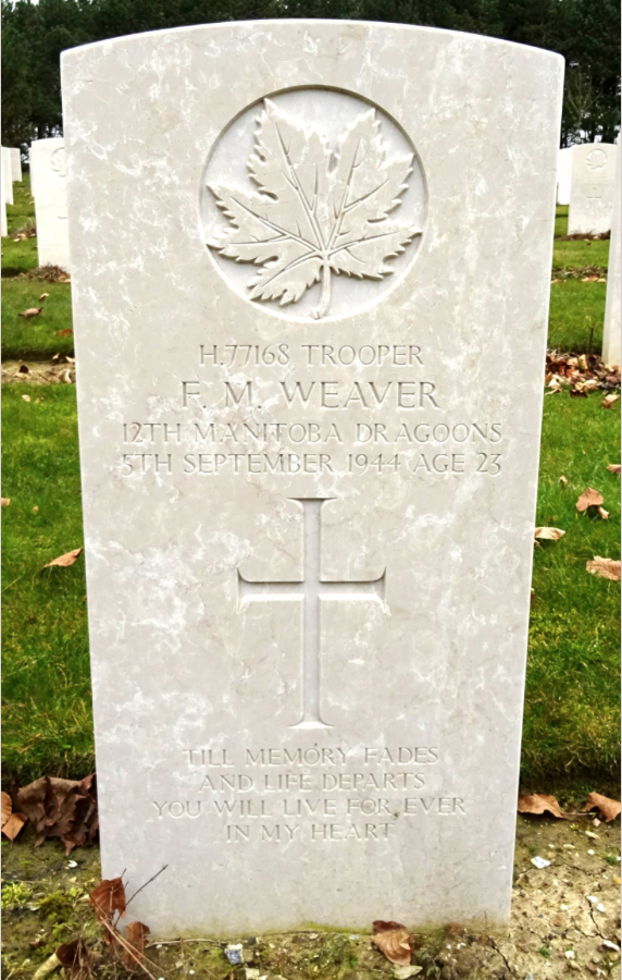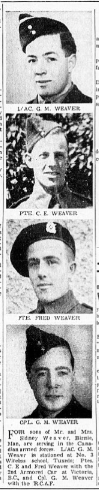 Brother of Corporal G. M. Weaver, Flying Officer Glen Mason Weaver, who died while serving with the Royal Canadian Air Force, and Private Charles Edward Weaver who died while serving with the Saskatoon Light Infantry (M.G.).