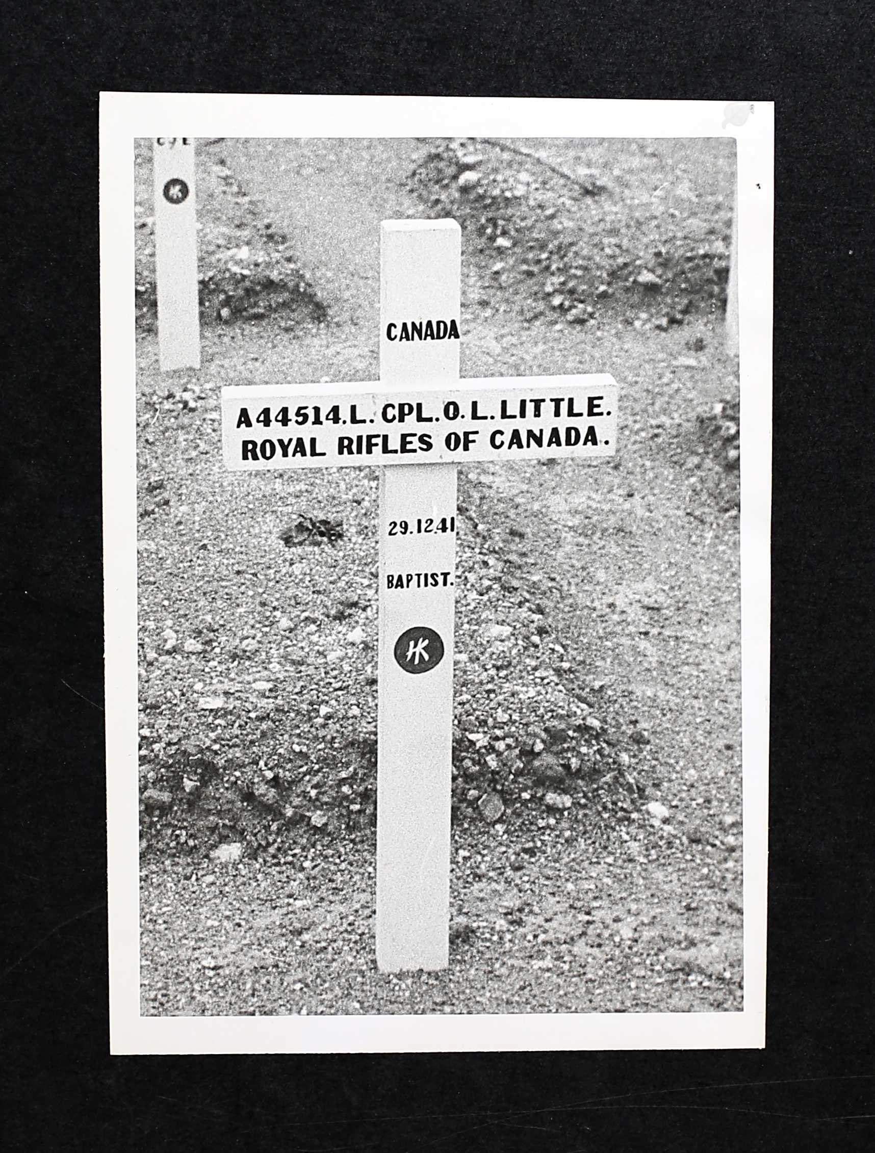 One brother served overseas during the Second World War, Private Lyle Delbert Little, with the 1st Divisional Supply Column, Royal Canadian Army Service Corps; a step-brother, Private Otice Talbert Spooner, served with the Canadian Army Ordnance Service. They both survived the war.
