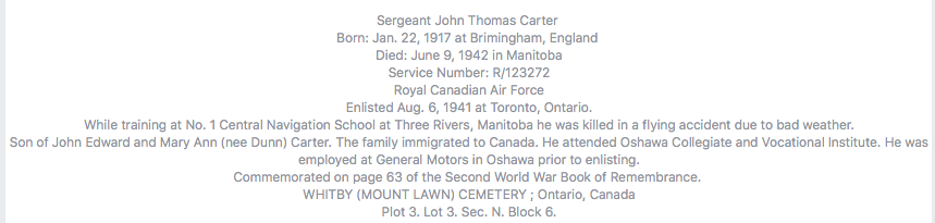Son of John Edward Carter and Mary Ann Dunn, of Oshawa, Ontario. During the First World War, his father, John Edward served as a driver with the Army Service Corps of the British Army, service number 045047.