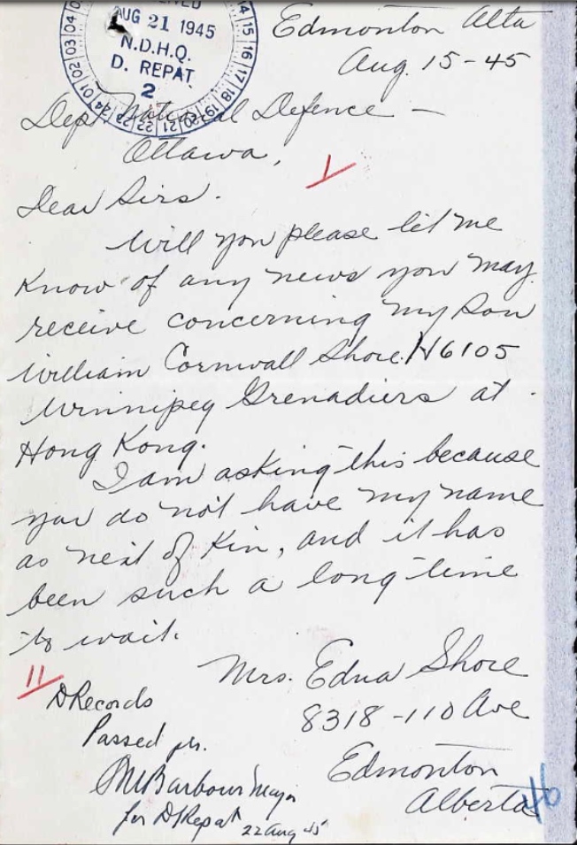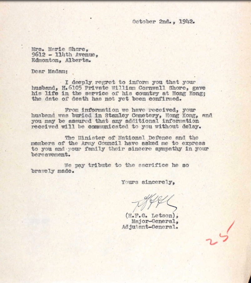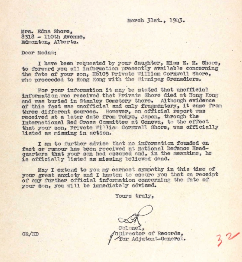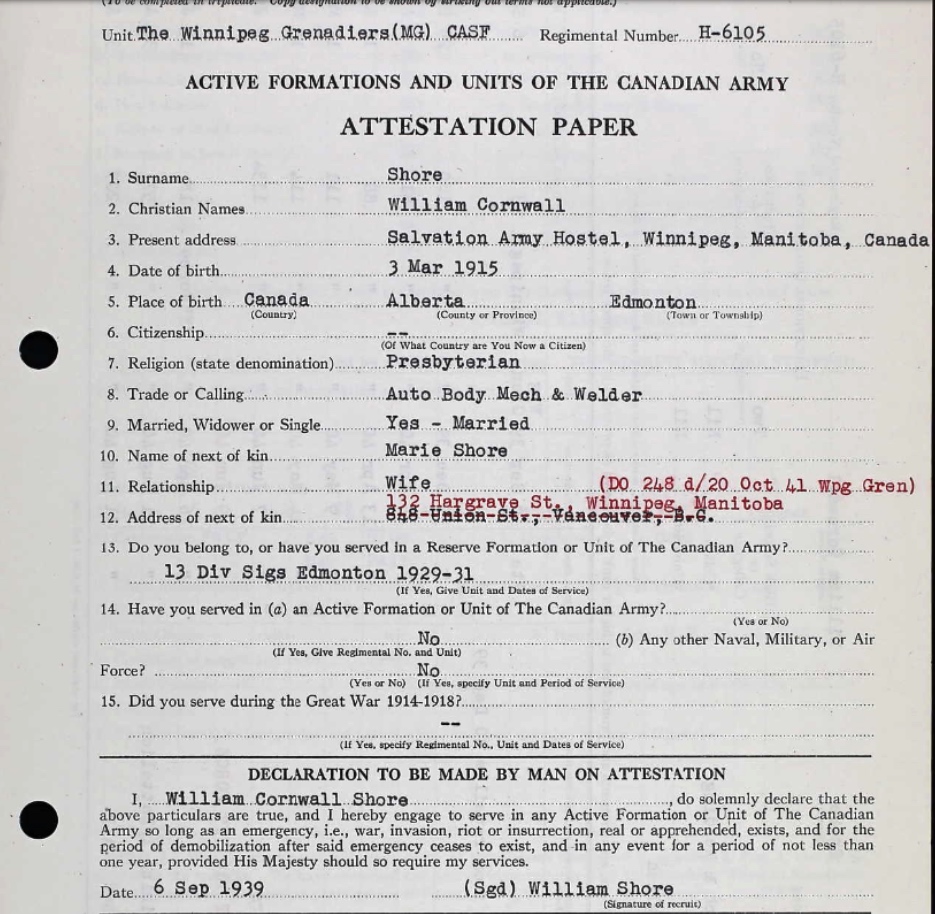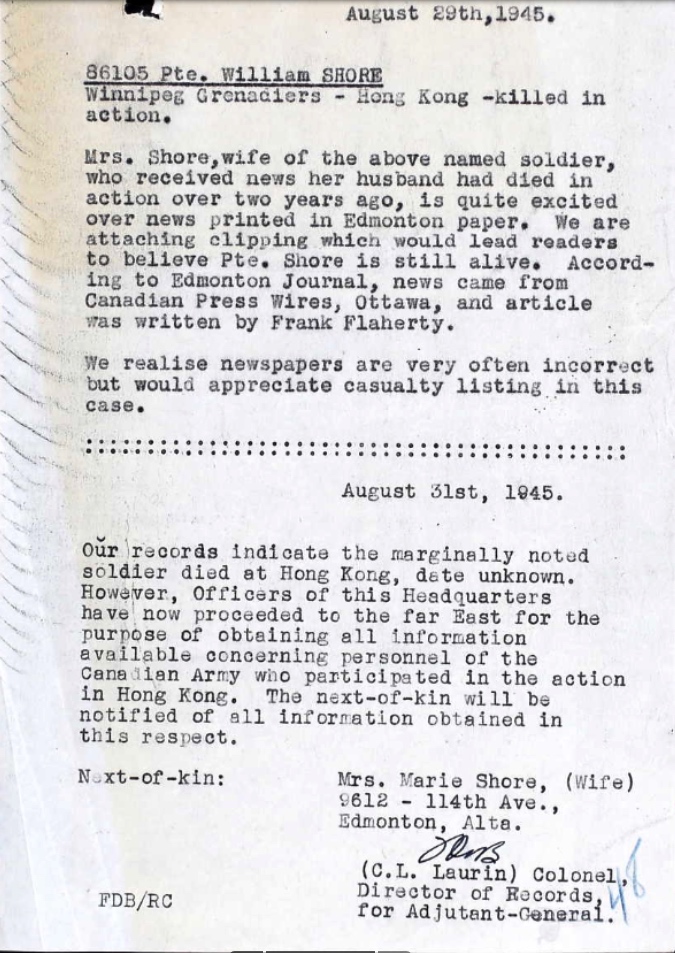 Brother of John Shore, who served in Europe with the Royal Canadian Air Force. He survived the war.