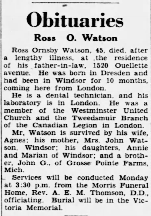Son of Sarah Watson, of Windsor; husband of Agnes L. Watson, of Windsor.