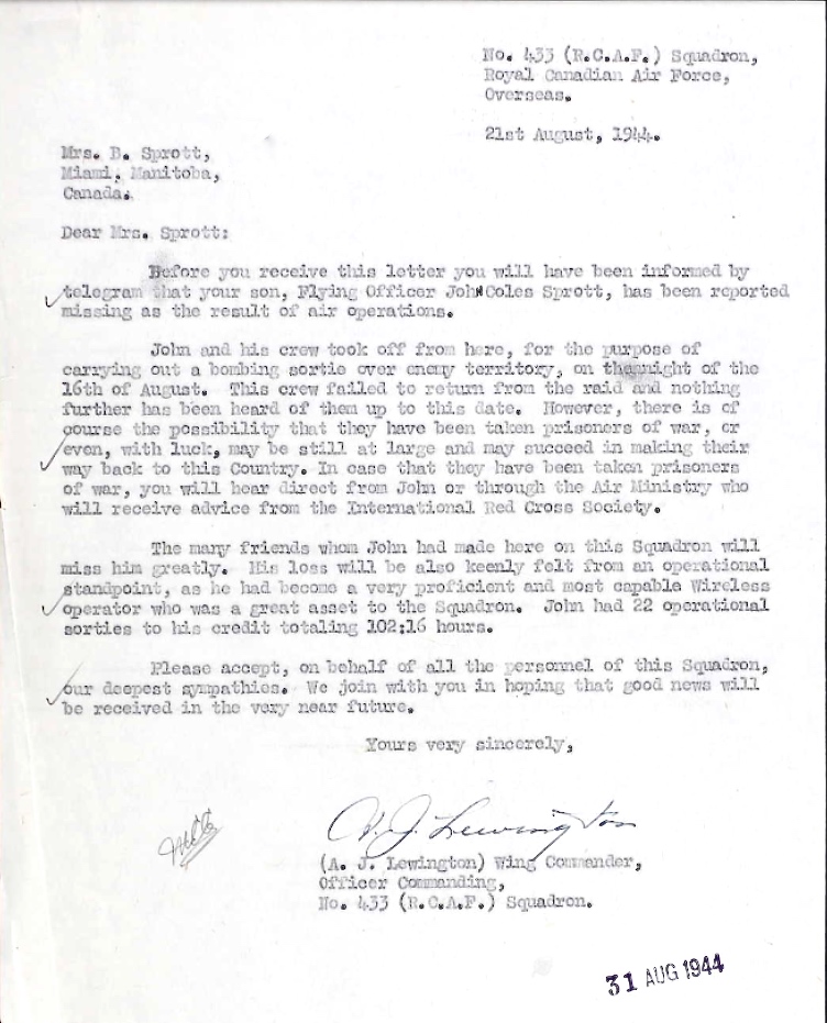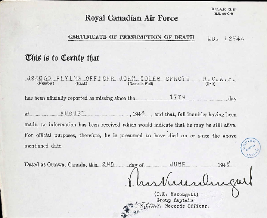 Brother of Leading Aircraftman Ronald Gear Sprott, who died on August 3, 1942, while serving with the Royal Canadian Air Force.