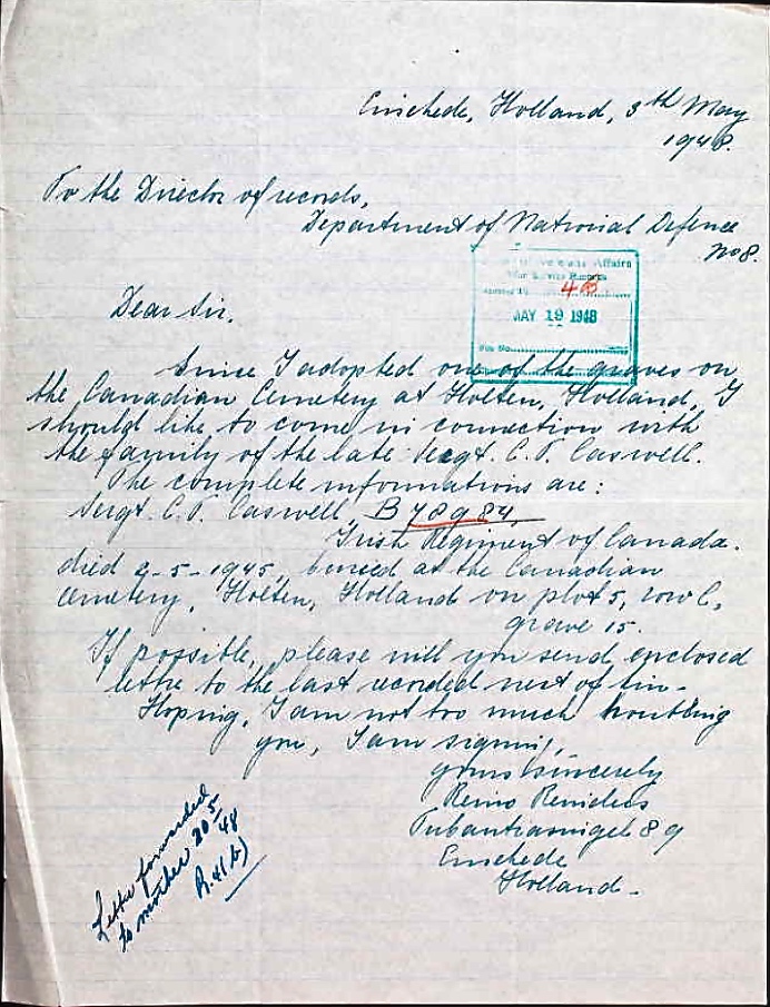 Historical Information: The Netherlands fell to the Germans in May 1940 and was not re-entered by Allied forces until September 1944. The great majority of those buried in Holten Canadian War Cemetery died during the last stages of the war in Holland, during the advance of the Canadian 2nd Corps into northern Germany, and across the Ems in April and the first days of May 1945. After the end of hostilities the remains of over 1,300 Canadian soldiers were brought together into this cemetery.