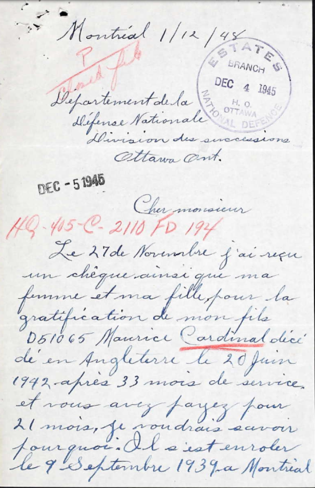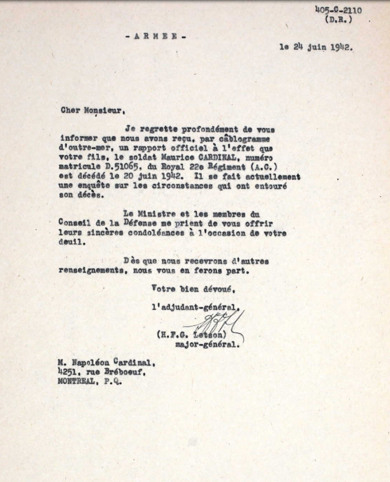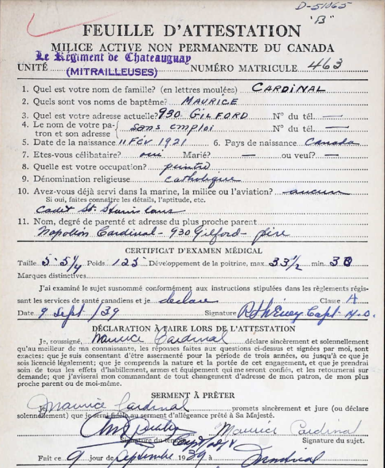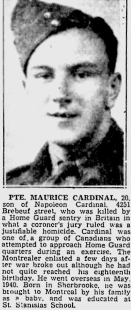 Baptized Joseph Charles Jean Maurice Cardinal. An army cadet in St-Stanislas, Québec, he enlisted in Montréal, Québec, on 9 September 1939, in the Régiment de Châteauguay (Mitrailleuses) of the active militia, regimental number 463. The same day, he was sent to the Régiment de St-Hyacinthe, Québec. On 3 October, he transferred to the regular forces of that unit, regimental number D-51065, before being transferred to the Royal 22e Régiment on the 26th. A soldier of many deeds, he embarked for England, arriving in Liverpool on 21 May 1940. At Singleton, Chichester, West Sussex, England on 20 June 1942, he was accidentally shot and killed by a security guard.