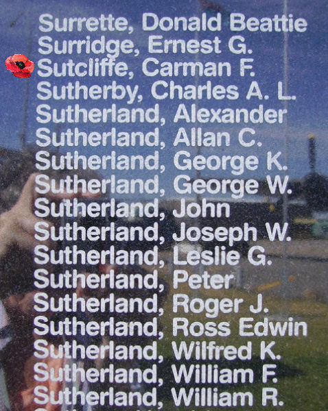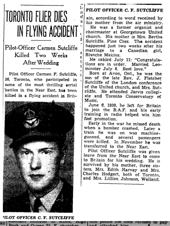 Born in Avon, Ontario in 1915, and raised in Georgetown, Ontario. Son of the Revd. Joseph Fletcher Sutcliffe, B.D., LL.D., and Agnes Bertha (née Mossip) Sutcliffe of St. Marys, Ontario. Husband of Blanche Olive Sutcliffe, of Cheltenham, Gloucestershire. Cousin of Lieutenant Harrison Taylor Mossip of the Royal Canadian Air Force who lost his life on March 7, 1945. Flying Officer Sutcliffe is commemorated on a bronze plaque located on the cenotaph in St. Marys, Ontario.